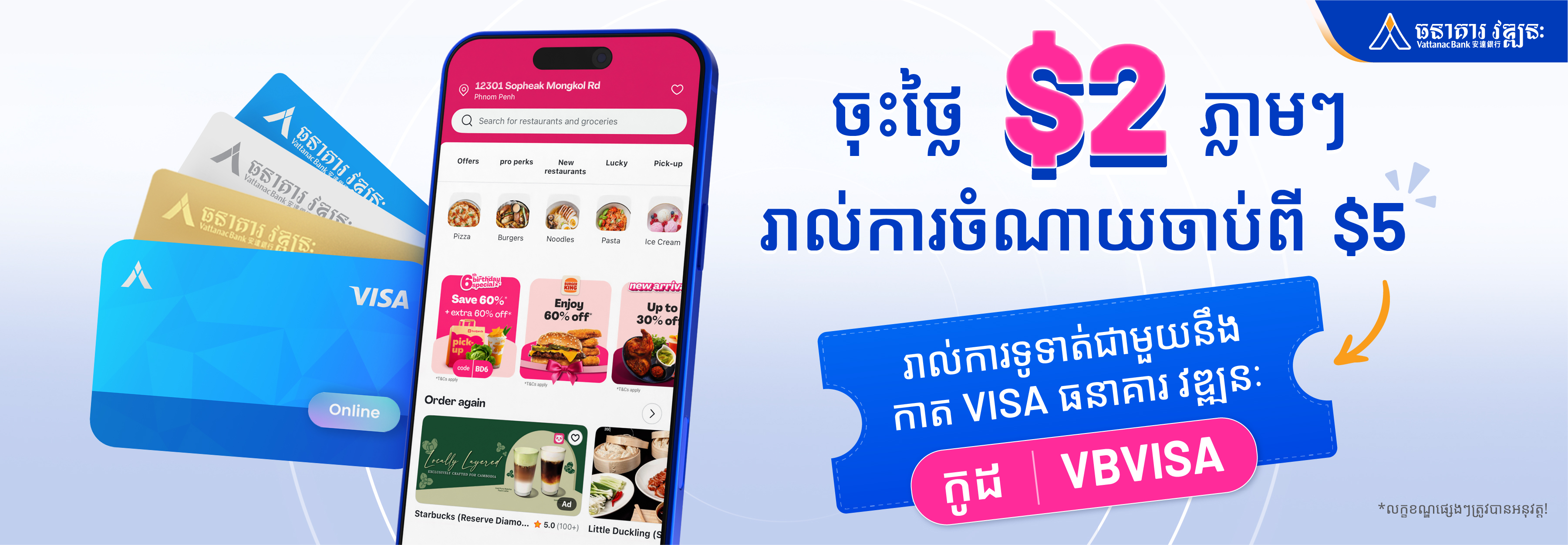 Make your everyday meals more rewarding with Vattanac Bank VISA Cards. Pay with your Vattanac Bank VISA Card on foodpanda and enjoy instant savings on your favorite meals.