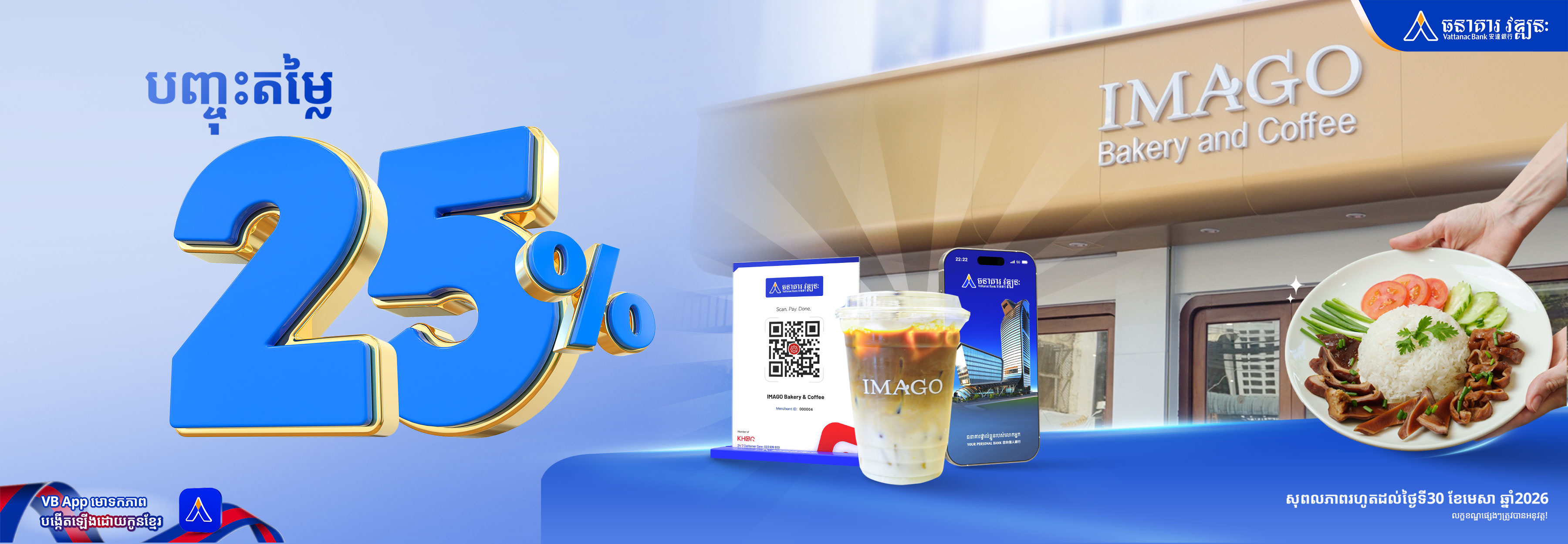Treat yourself to freshly baked pastries and comforting coffee at IMAGO Bakery & Coffee with an exclusive 25% discount when you pay using your Vattanac Bank VISA Card or via VB App.